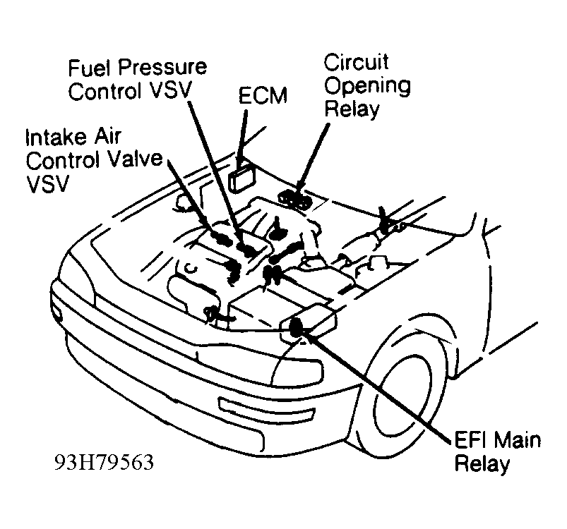 - The Engine Control Module (ECM) controls the intake air control valve VSV ground circuit on the Blue/Green wire. ECM is located behind glove box. If necessary to check EFI main relay, see EFI MAIN RELAY under RELAYS. Repair as necessary and recheck system operation.