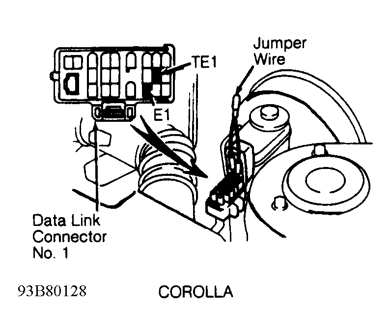 - Apply parking brake and place transmission/transaxle in Neutral. Install Jumper Wire (SST 09843-18020) between terminals TE1 and E1 of data link connector No. 1. See Fig 1. Start engine and note engine RPM.NOTE: Data link connector No. 1 is located in engine compartment.