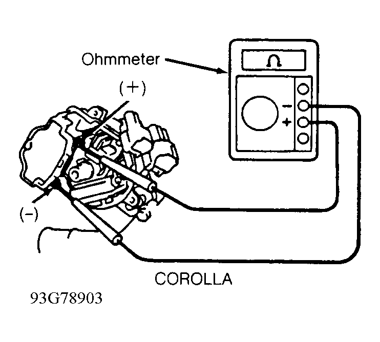 - Disconnect wiring from ignition coil so ignition coil is isolated from system. Using ohmmeter, check primary resistance between ignition coil positive (+) and negative (-) terminals. See Fig 1.