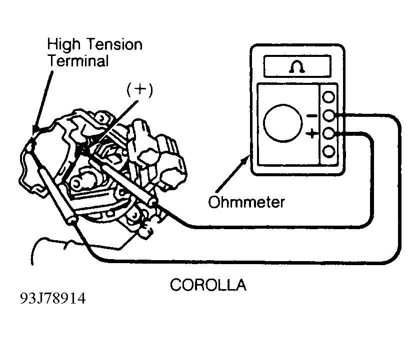 - Check secondary resistance between ignition coil positive (+) terminal and high tension wire terminal (coil wire tower). See Fig 2. Replace ignition coil if resistance is not within specification. See appropriate IGNITION COIL RESISTANCE table.