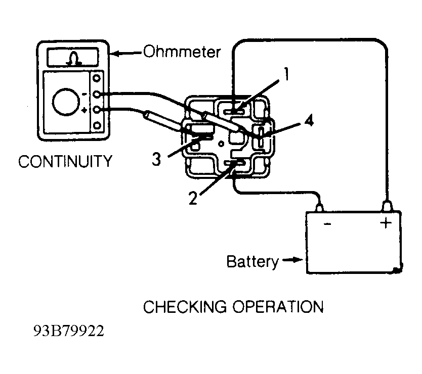- Check EFI main relay operation by applying battery voltage and ground and checking continuity between specified terminals. See Fig 1 and Fig 2. Replace EFI main relay if defective.