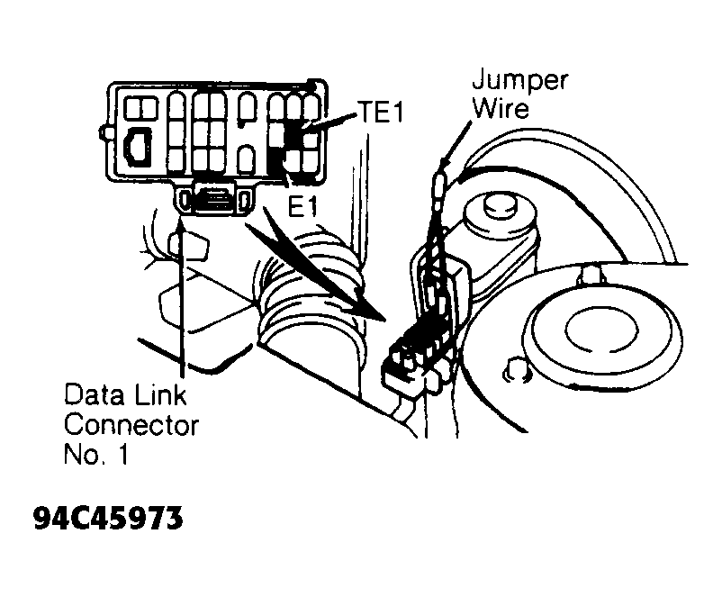 - Apply parking brake and place transmission/transaxle in Neutral. Install Jumper Wire (SST 09843-18020) between terminals TE1 and E1 of data link connector No. 1. See Fig 1. Start engine and note engine RPM.NOTE: Data link connector No. 1 is located in engine compartment.
