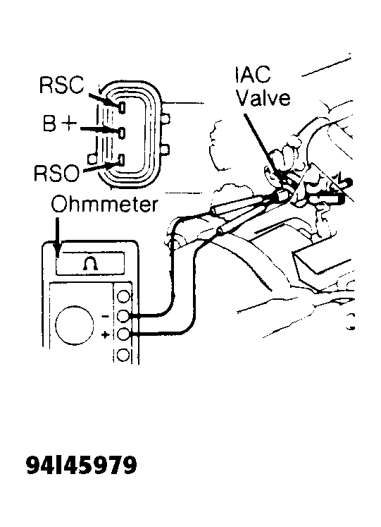 - To check IAC valve resistance, ensure ignition is off. Disconnect electrical connector from IAC valve located on lower area of throttle body. Using ohmmeter, measure resistance between terminal B+ and each remaining terminal. See Fig 2.