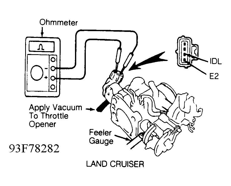 - Disconnect electrical connector from Throttle Position Sensor (TPS). Loosen TPS mounting screws. Connect ohmmeter between terminals IDL and E2. See Fig 1.