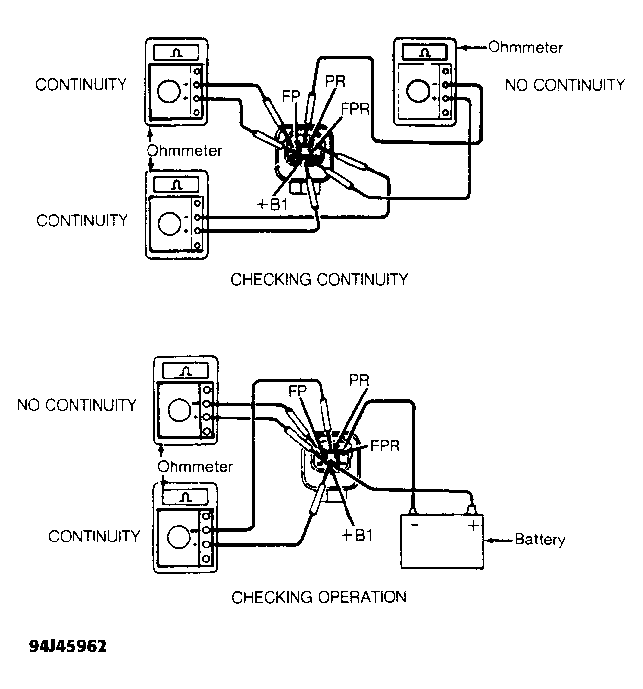 - Ensure ignition is off. Remove fuel pump relay. See FUEL PUMP RELAY LOCATION table. Using ohmmeter, check continuity between specified terminals. See Fig 1.