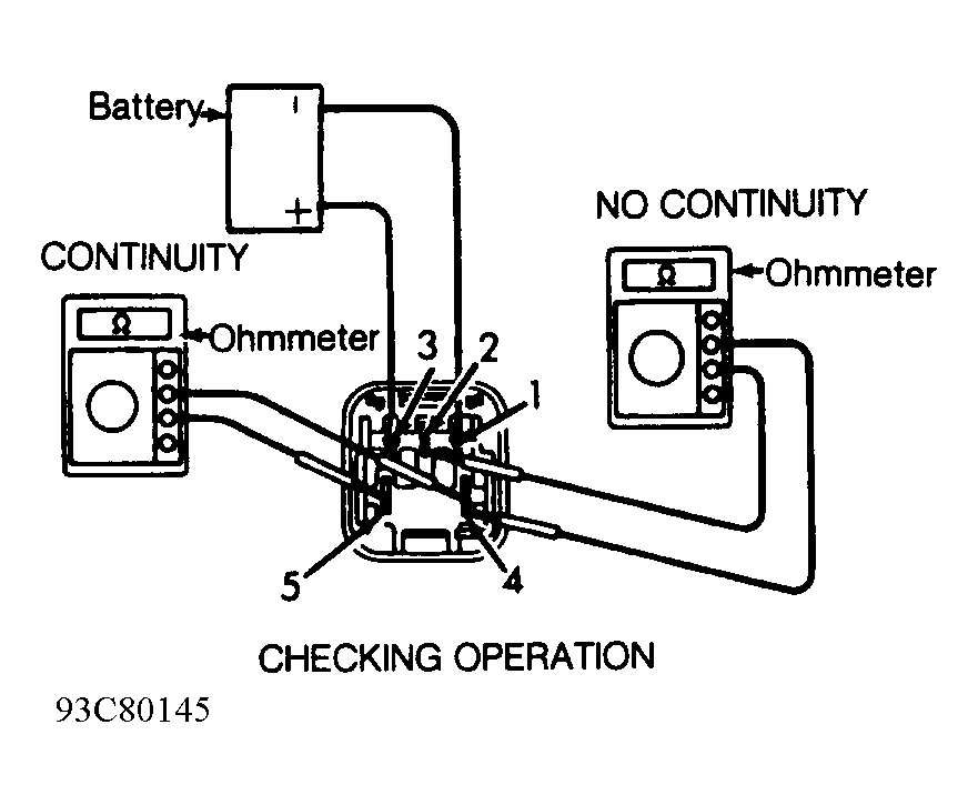 - Using ohmmeter, check continuity between specified terminals. See Fig 1 and Fig 2. Check ignition main relay operation by applying battery voltage and ground and checking continuity between specified terminals. See Fig 1 and Fig 2. Replace ignition main relay if defective.