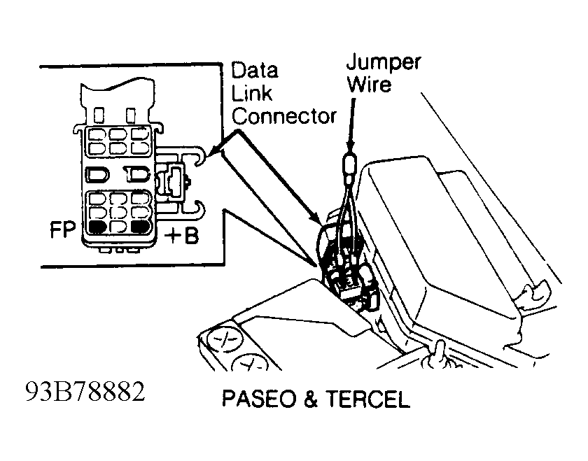 - Install jumper wire between +B and FP terminals of data link connector. See Figure. Data link connector is located in engine compartment.