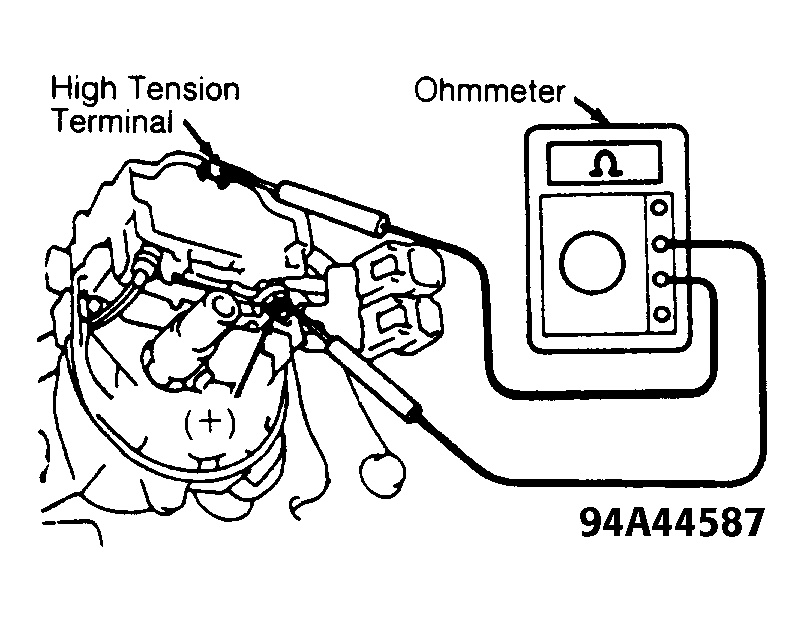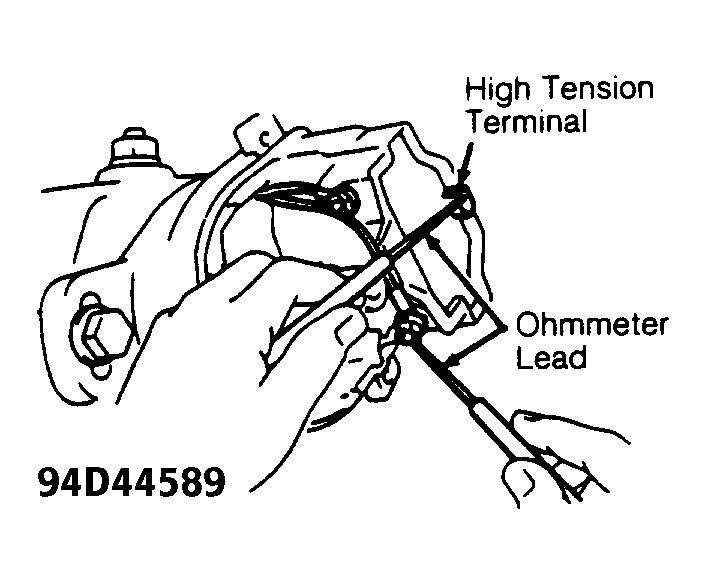 - Check secondary resistance between ignition coil positive (+) terminal and high tension terminal (coil wire tower). See Fig 3 and Fig 4. Replace ignition coil if resistance is not within specification. See appropriate IGNITION COIL RESISTANCE table.