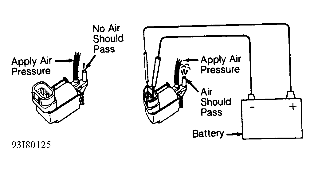 - Ensure no continuity exists between each electrical terminal and body of idle-up VSV body. To check idle-up VSV operation, apply air pressure to designated area and checking air passage, and then applying battery voltage and ground and retesting. See Fig 1. Replace idle-up VSV if defective.