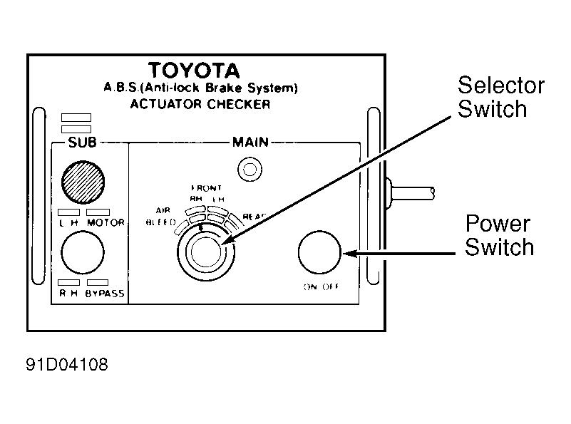 4. Start engine and let idle. Set actuator checker selector switch to AIR BLEED position. See Figure. Press and hold brake pedal firmly. Press power switch 5 times within 3 seconds.