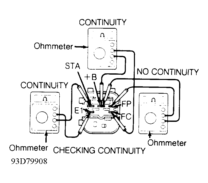 - Check circuit opening relay operation by applying battery voltage and ground and checking continuity between specified terminals. See Fig 1, Fig 2 and Fig 3. Replace circuit opening relay if defective.