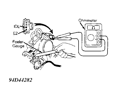 - Disconnect electrical connector from Throttle Position Sensor (TPS). Loosen TPS mounting screws. Connect ohmmeter between terminals IDL and E2. See Fig 1 and Fig 2.