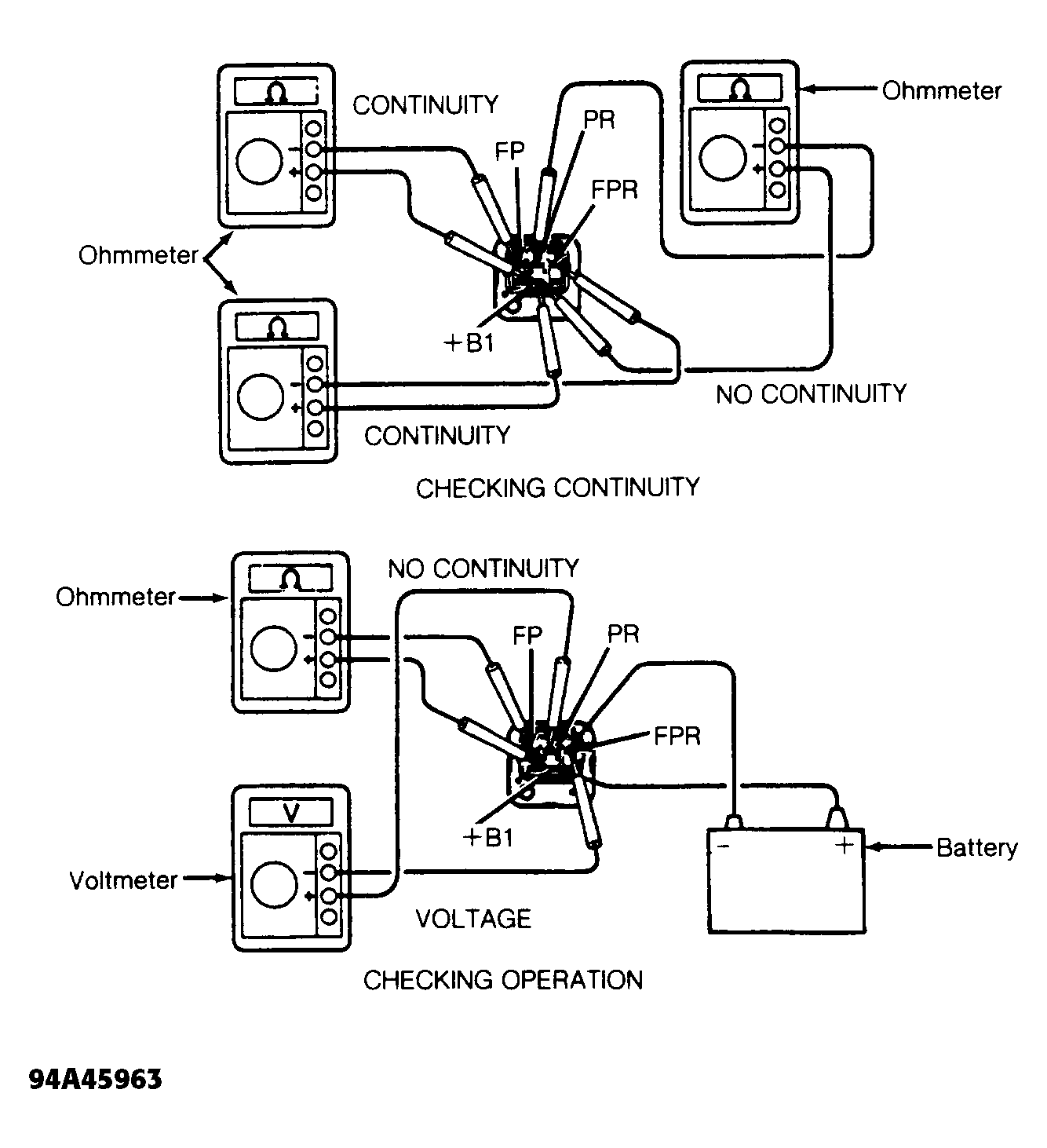 - Using ohmmeter, check continuity between specified terminals. See Fig 1. Check fuel pump relay operation by applying battery voltage and ground. Check continuity and voltage between specified terminals. See Fig 1. Replace fuel pump relay if defective.