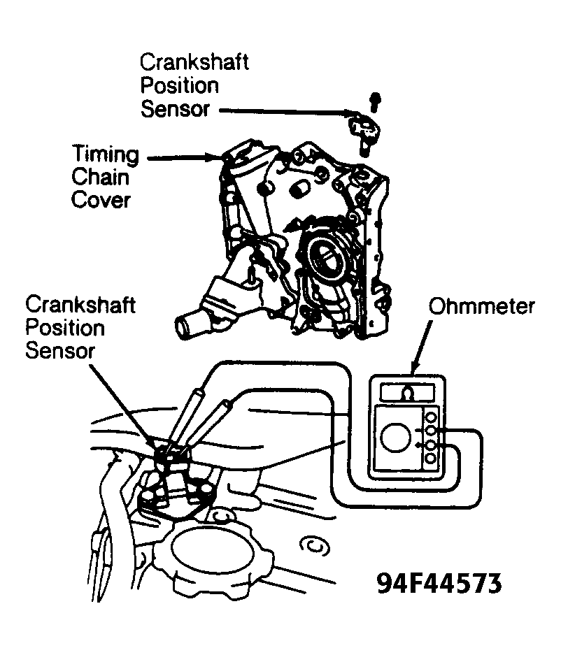 - Using ohmmeter, measure resistance between electrical terminals on crankshaft position sensor. See Fig 1. Replace crankshaft position sensor if resistance is not 1630-2740 ohms at 14-122°F (-10-50°C). Reinstall electrical connector.