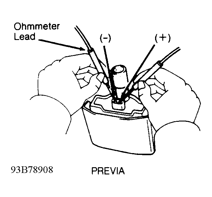 - Disconnect wiring from ignition coil so ignition coil is isolated from system. Using ohmmeter, check primary resistance between ignition coil positive (+) and negative (-) terminals. See Fig 1.