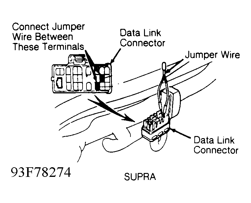 - Shut engine off. Install Jumper Wire (SST 09843-18020) between terminals TE1 and E1 of data link connector located in engine compartment. See Fig 2. Start engine.