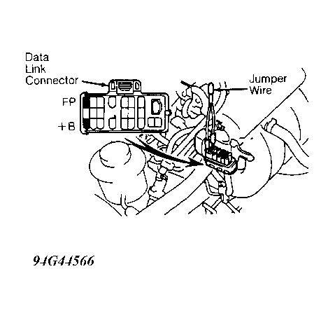 - Install jumper wire between +B and FP terminals of data link connector. See Figure. Data link connector is located in engine compartment.