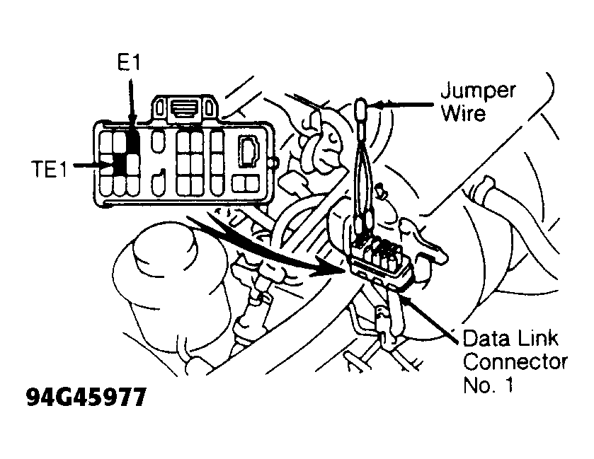 2. Apply parking brake and place transmission/transaxle in Neutral. Install Jumper Wire (SST 09843-18020) between terminals TE1 and E1 of data link connector No. 1. See Fig 1. Start engine and note engine RPM.