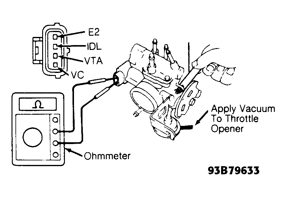 - Turn ignition off. Disconnect electrical connector from Throttle Position Sensor (TPS) on throttle body. Note terminal identification. See Fig 1 and Fig 2.