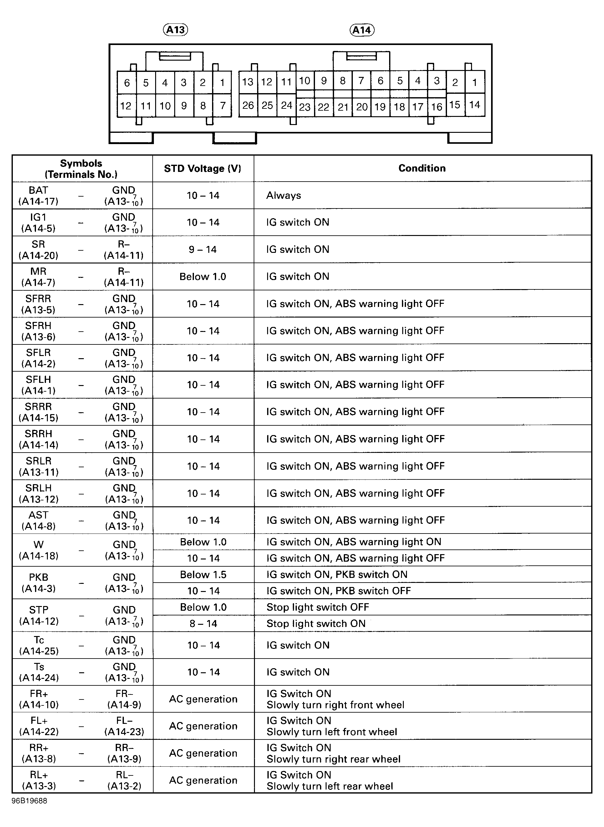 For component testing, see CIRCUIT TESTS . ABS ECU values can be measured using Toyota Hand-Held Tester and Breakout Box. ABS circuits and harness can also be tested by backprobing ABS ECU connectors and comparing measured voltages with ABS ECU standard values chart. See Fig 1.