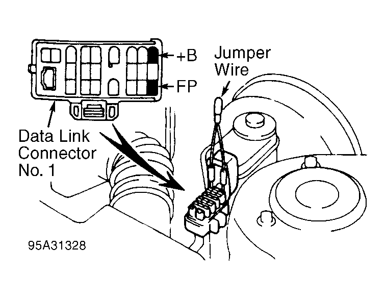 4. Install Jumper Wire (SST 09843-18020) between +B and FP terminals of data link connector No. 1. See Figure. Turn ignition on and note fuel pressure.