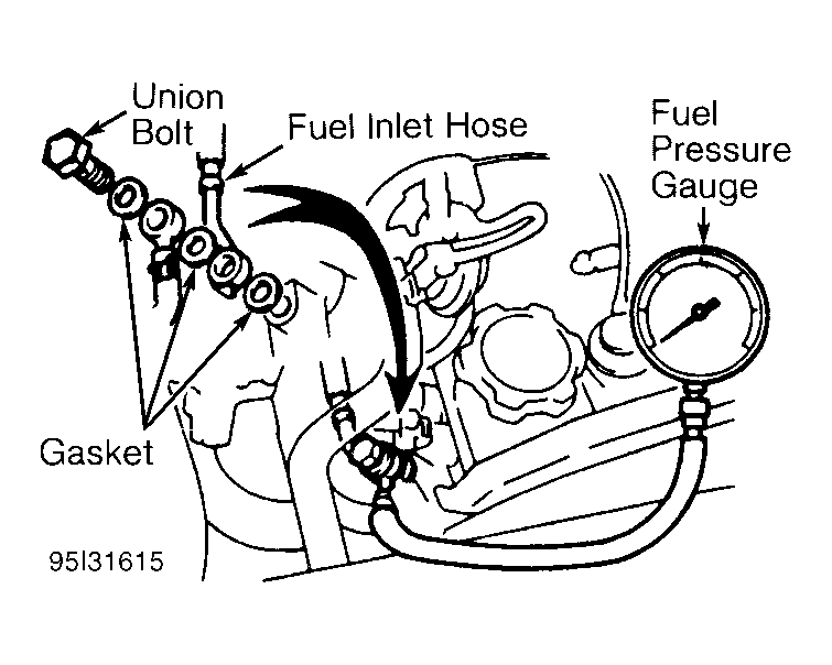 - Disconnect negative battery cable. Remove fuel pressure gauge. Reinstall union bolt using NEW gaskets. Tighten union bolt. Install negative battery cable.