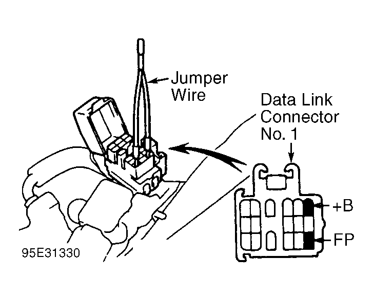 4. Install Jumper Wire (SST 09843-18020) between +B and FP terminals of data link connector No. 1. See Figure. Turn ignition on and note fuel pressure.