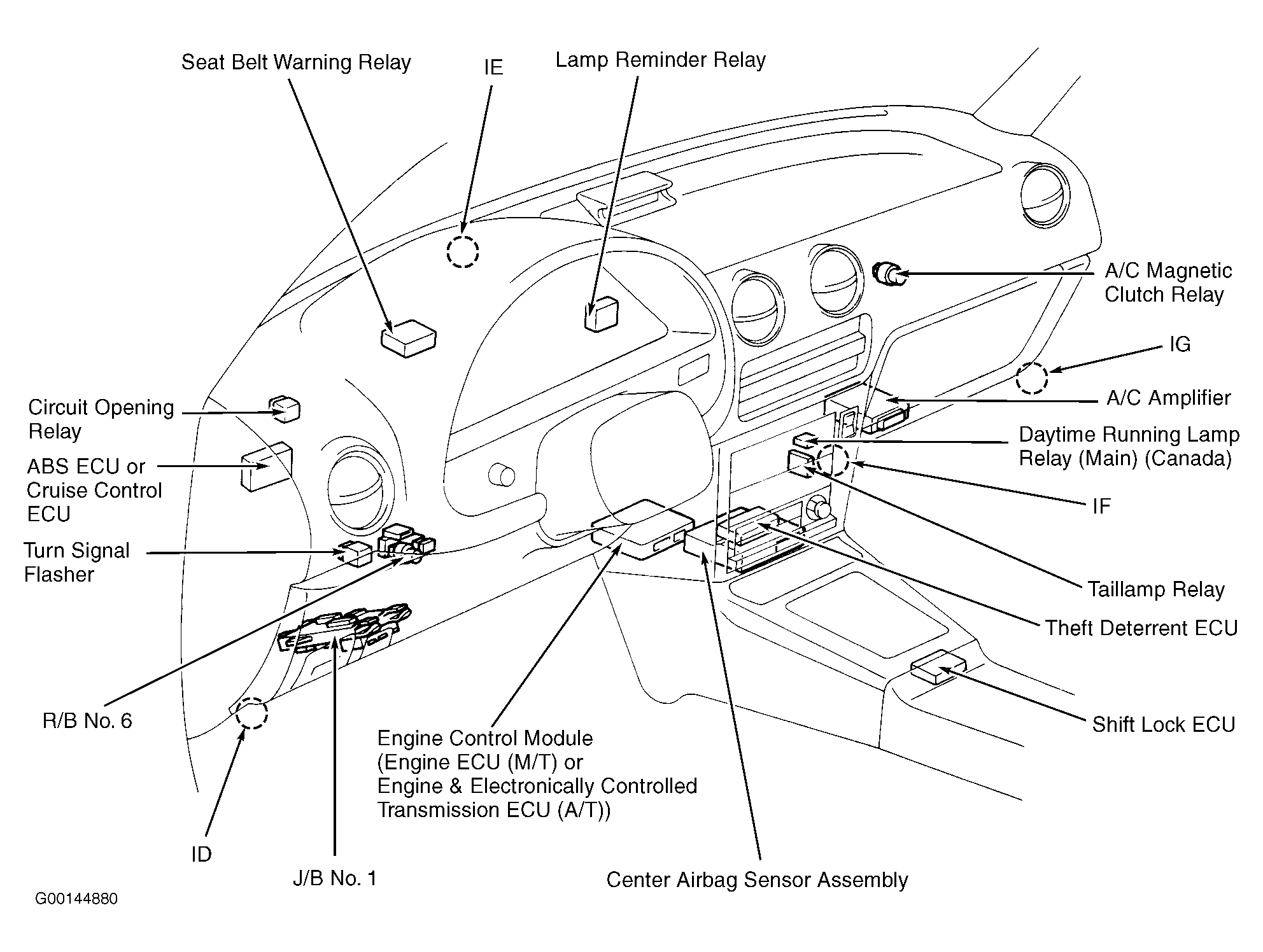 | Engine Control Module (Engine ECU) (M/T) or Engine & Electronically Controlled Transmission ECU (A/T) | Below center of dash. See Figure. |