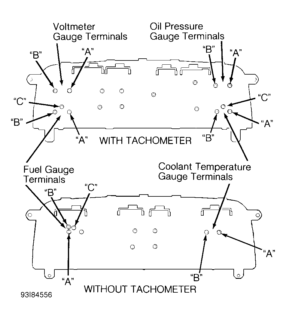 Using an ohmmeter, measure resistance between voltmeter gauge terminals. See Figure. Resistance should be 347 ohms. If resistance is not as specified, replace voltmeter gauge.