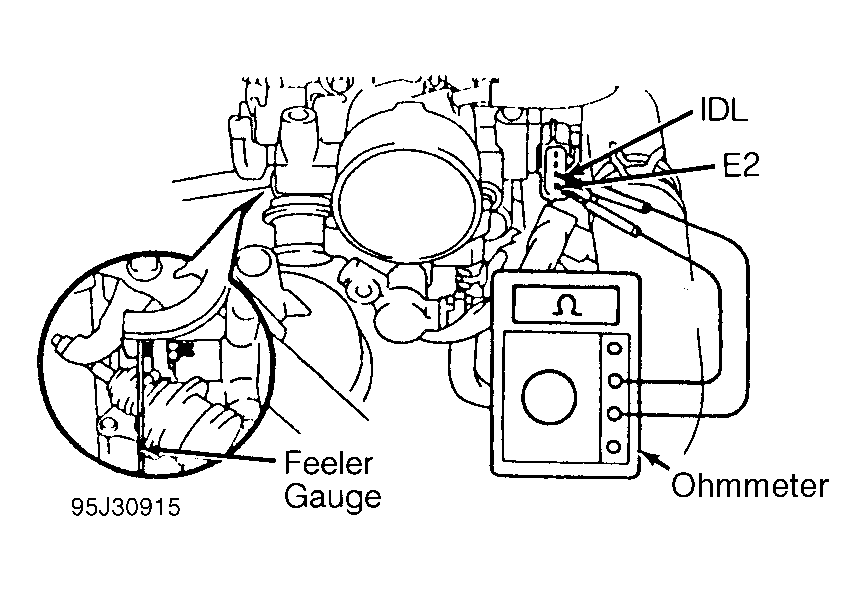 - Disconnect electrical connector from Throttle Position Sensor (TPS). Loosen TPS mounting screws. Connect ohmmeter between terminals IDL and E2. See Fig 1.