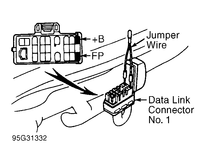 - Install Jumper Wire (SST 09843-18020) between +B and FP terminals of data link connector No. 1. See Figure. Turn ignition on and note fuel pressure.