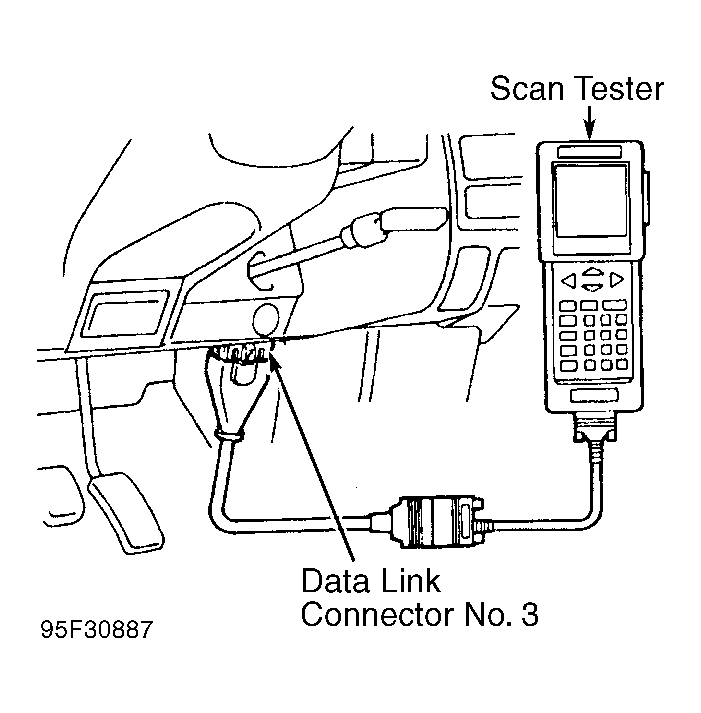- Connect scan tester to data link connector No. 3. See Fig 1. Scan tester is used to read engine RPM.