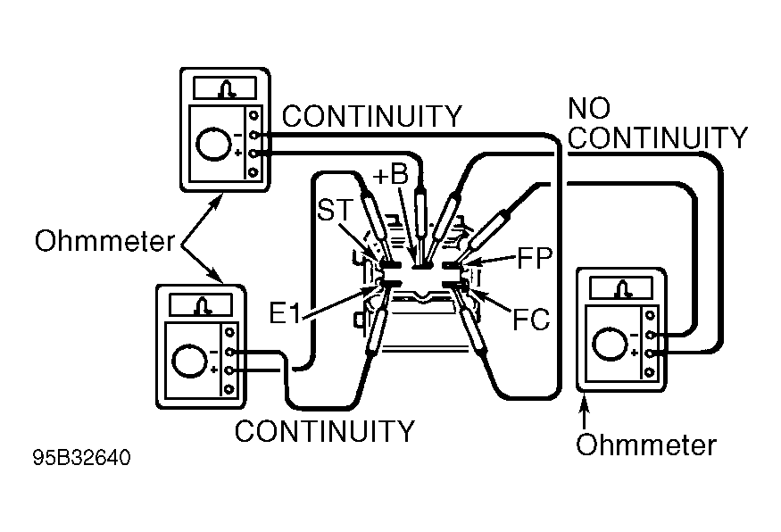 Application Relay Location T100 Behind Glove Box, Near Passenger's Side Kick Panel - Using ohmmeter, check continuity between specified terminals. See Fig 1.