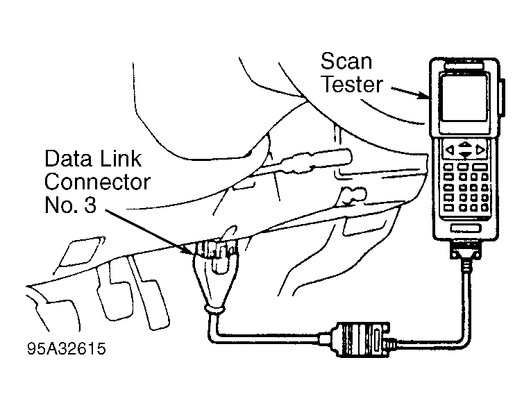 4. Install scan tester on data link connector No. 3. See Figure. Using scan tester manufacturer's instructions, activate electric fuel pump and note fuel pressure. Fuel pressure should be within specification. See FUEL PUMP PERFORMANCE  table.