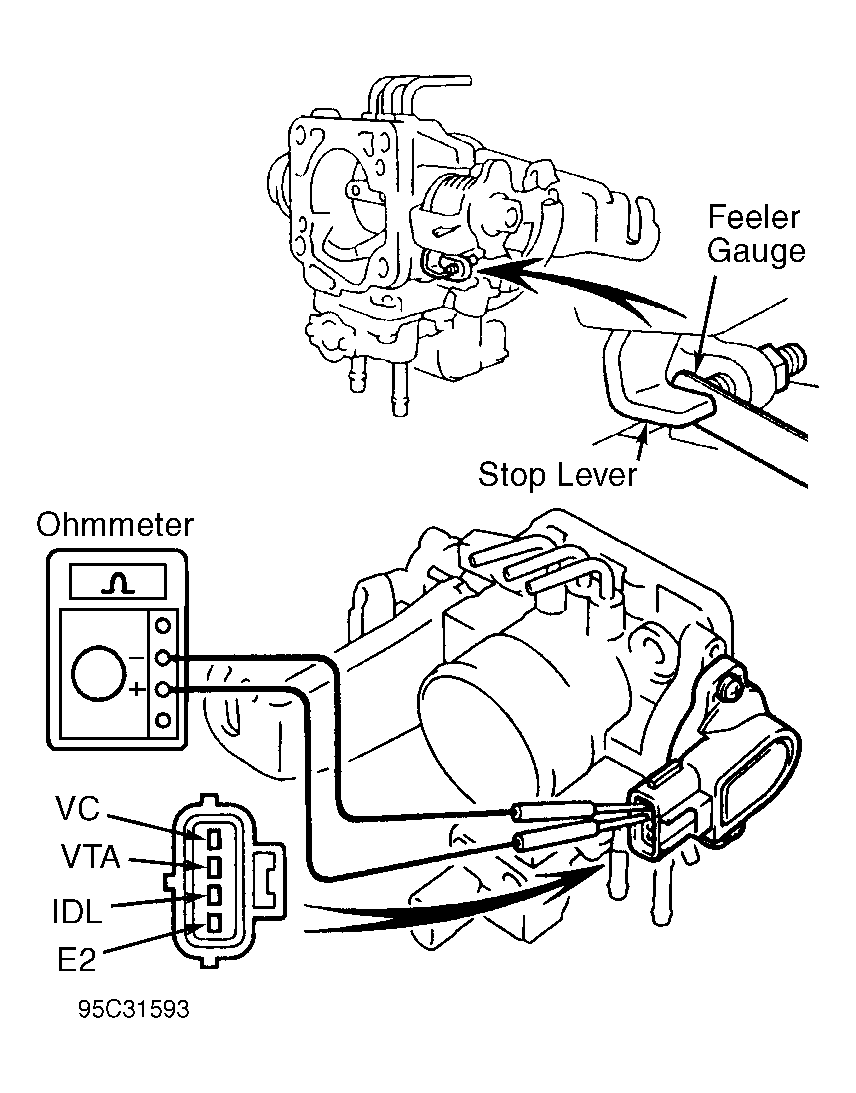 2. Insert specified thickness feeler gauge between throttle stop screw and throttle lever and check resistance or continuity. See the TPS RESISTANCE SPECIFICATIONS  table. Replace or adjust TPS if not within specification.