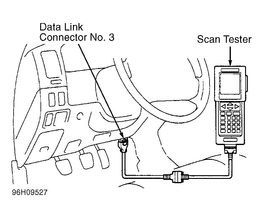 5. Remove cover (if equipped) and install scan tester on data link connector No. 3. See Figure. Turn ignition on. DO NOT start engine.