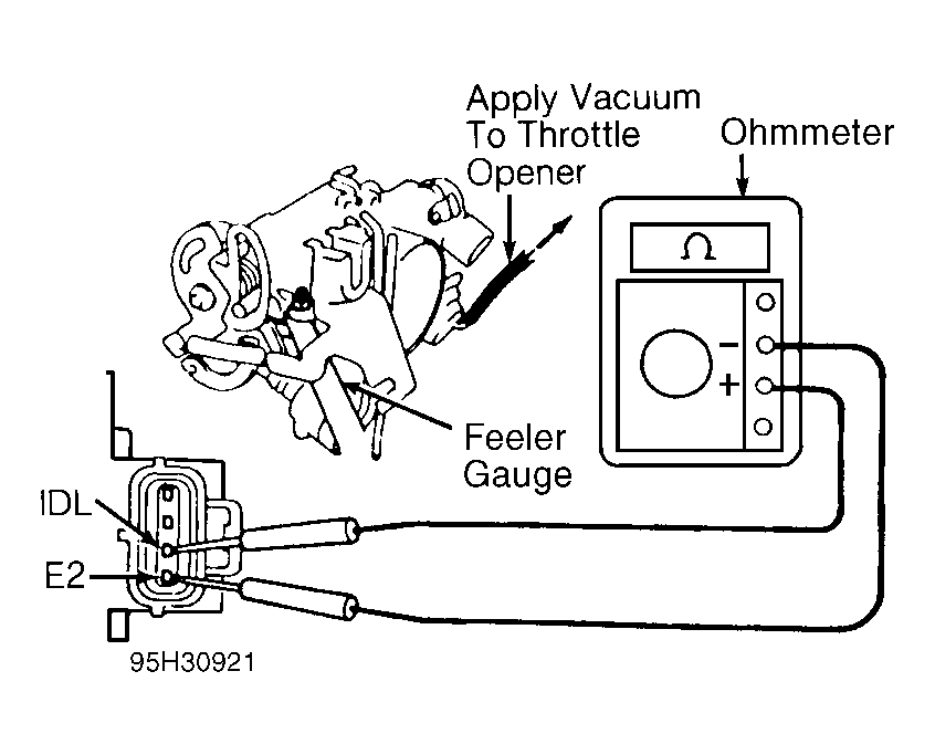 - Disconnect electrical connector from Throttle Position (TP) sensor. Loosen TP sensor mounting screws. Connect ohmmeter between terminals IDL and E2. See Fig 1.