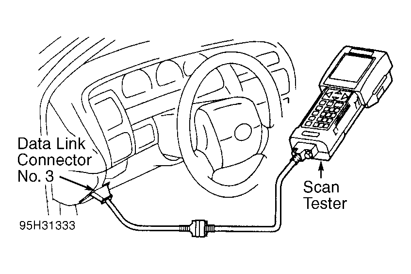 - Remove cover (if equipped) and install scan tester on data link connector No. 3. See Figure. Turn ignition on. DO NOT start engine.