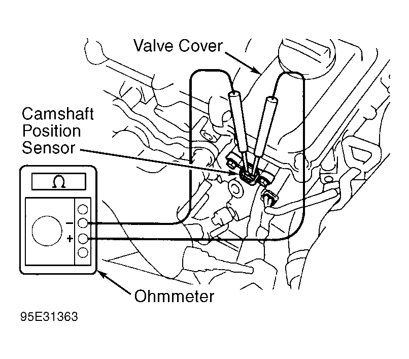 - Disconnect electrical connector from camshaft position sensor, located on rear of front (radiator side) cylinder head, just below valve cover. See Fig 1. Using ohmmeter, check resistance between electrical terminals on camshaft position sensor.