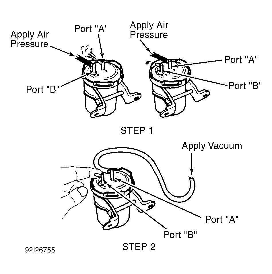 - Plug port "B" on vacuum tank. Using vacuum pump, apply 8 in. Hg of vacuum to port "A". Perform STEP 2. See Fig 2. Ensure vacuum reading will hold for at least one minute. Replace vacuum tank if defective and recheck system operation. If vacuum tank is okay, reconnect vacuum hoses. Proceed to next step.