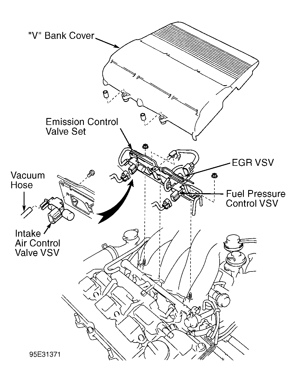 - Remove "V" bank cover located on top of engine. See Fig 3. Disconnect electrical connector and vacuum hoses from intake air control valve Vacuum Switching Valve (VSV) located near valve cover. See Fig 3.NOTE: It may be necessary to remove emission control valve set which contains various vacuum switching valves for access to intake air control valve VSV.