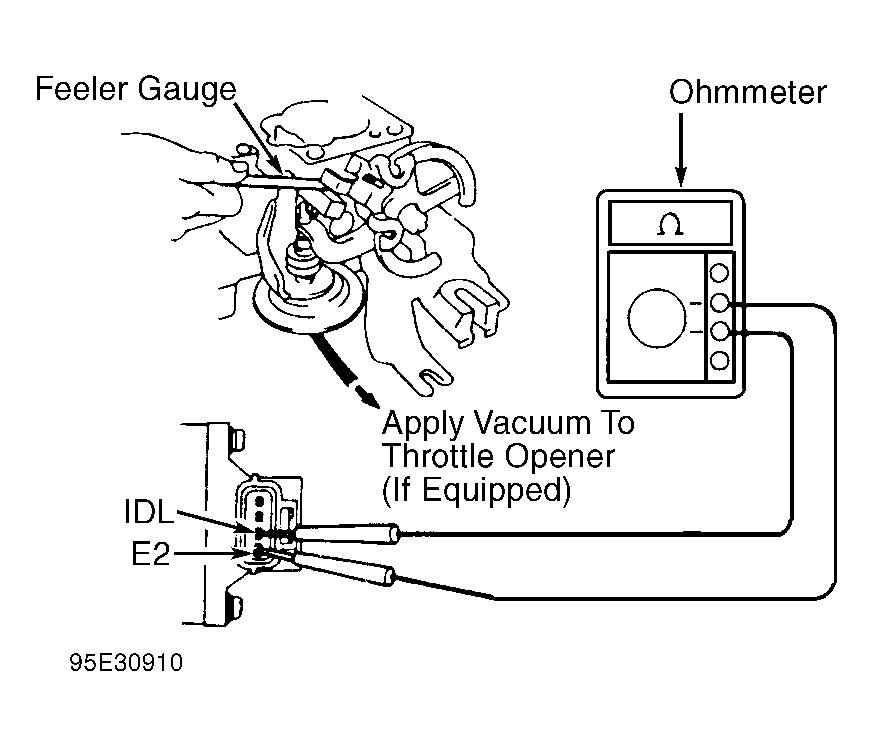 - Disconnect electrical connector from Throttle Position (TP) sensor. Loosen TP sensor mounting screws. Connect ohmmeter between terminals IDL and E2. See Fig 1.