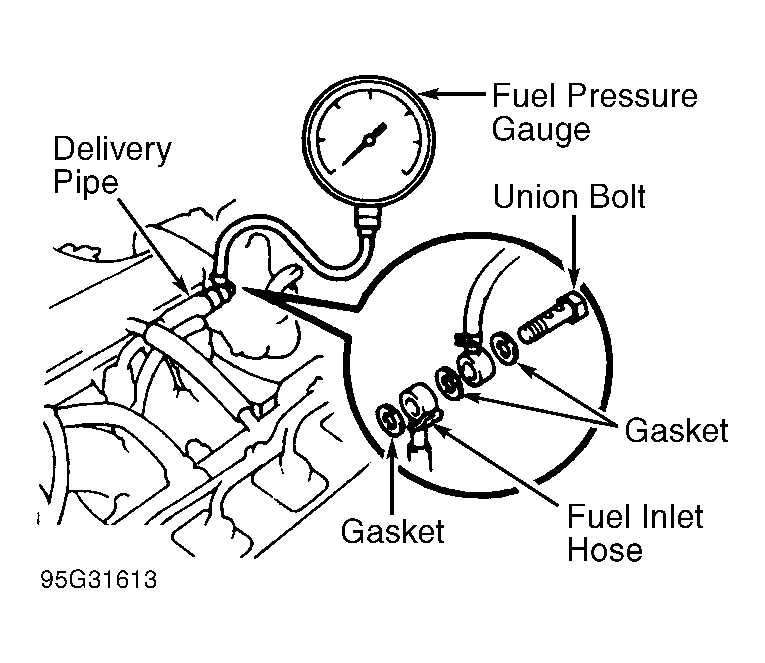 13. Disconnect negative battery cable. Remove fuel pressure gauge. Reinstall union bolt using NEW gaskets. Tighten union bolt. Install negative battery cable. Recheck for fuel leaks.