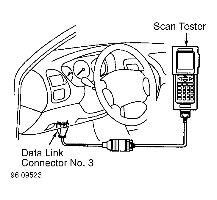 5. Remove cover (if equipped) and install scan tester on data link connector No. 3. See Figure. Turn ignition on. DO NOT start engine.
