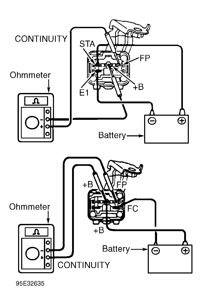- To test circuit opening relay operation, apply battery voltage and ground to relay and use ohmmeter to check continuity between specified terminals. See Fig 1 and Fig 2. Replace circuit opening relay if defective.