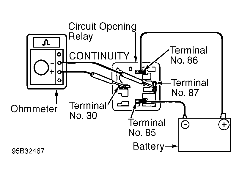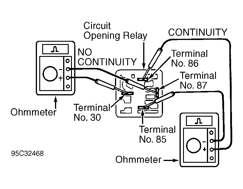 - To test circuit opening relay operation, apply battery voltage and ground to relay and use ohmmeter to check continuity between specified terminals. See Fig 1 and Fig 2. Replace circuit opening relay if defective.