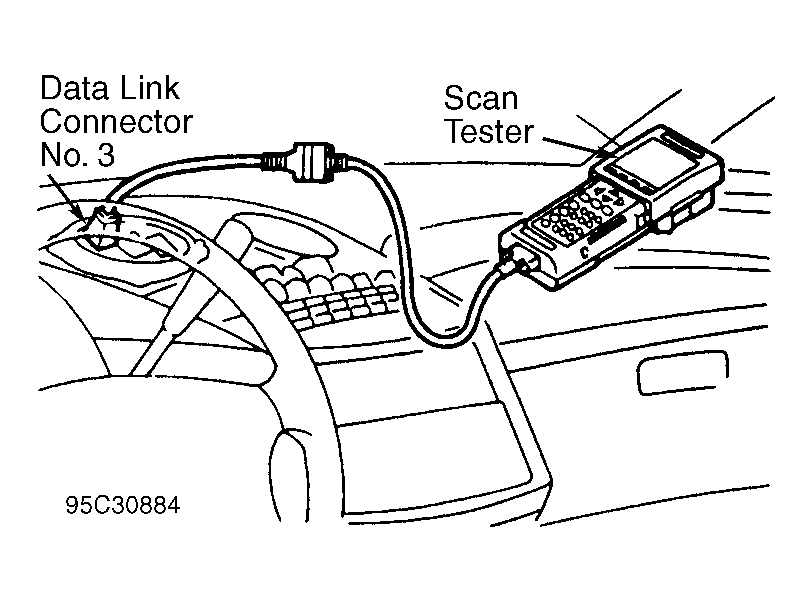 1. Start and warm engine to normal operating temperature. Shut engine off. Connect timing light to spark plug wire on cylinder No. 1 (front cylinder at timing chain end of engine). Remove upper panel from instrument panel and connect scan tester to data link connector No. 3. See Fig 1. Scan tester is used to read engine RPM.