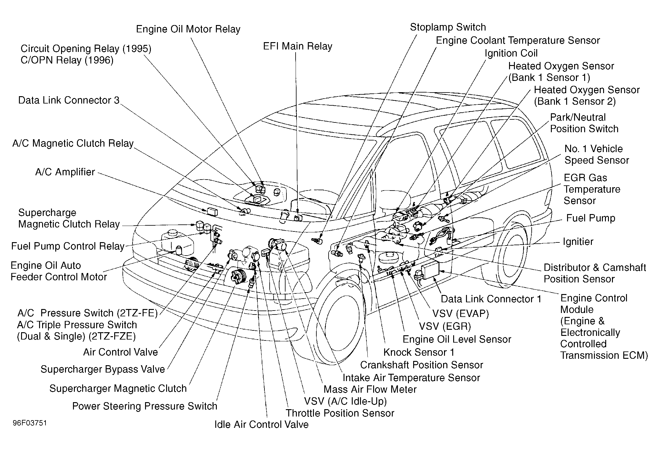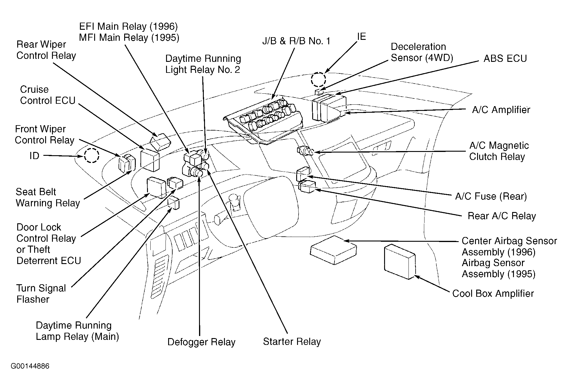 | Air Bag Sensor Assembly (Center) (1996) | Below center of dash. See Figure. |