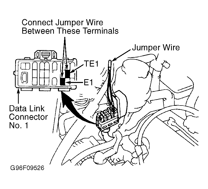 - Install Jumper Wire (SST 09843-18020) between terminals TE1 and E1 of data link connector No. 1. See Fig 2. Apply parking brake. Place transaxle in Neutral. Start engine and allow engine to idle.
