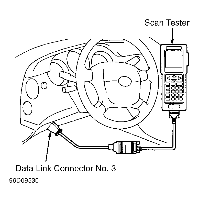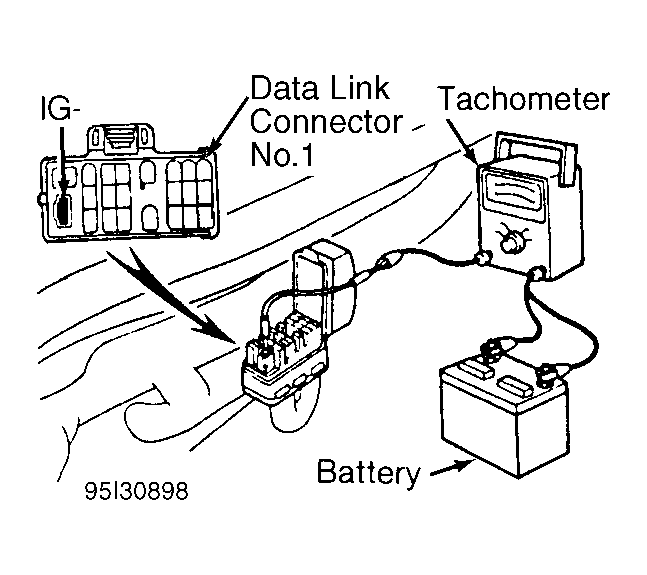 - On non-turbo models, connect timing light to spark plug wire on cylinder No. 1 (front cylinder at timing belt end of engine). Connect scan tester to data link connector No. 3. See Fig 1 and Fig 2. Scan tester is used to read engine RPM.